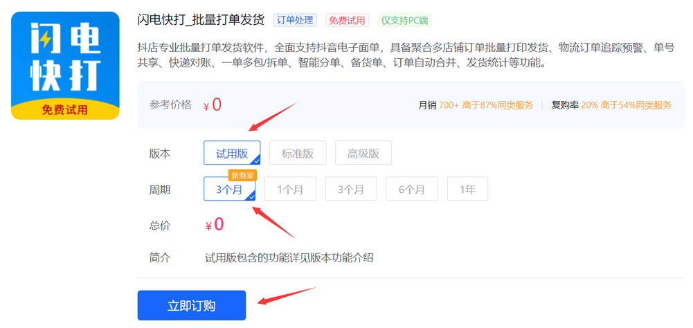 3、点击试用版-3个月,后续也可以续订标准的,提交(说明:现在得订购标准版或高级版的,免费版的不支持绑定同步)