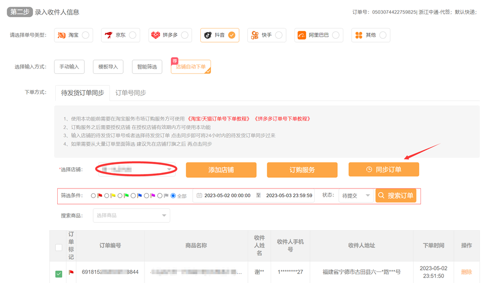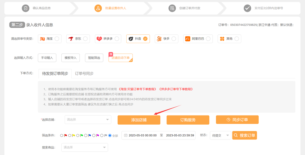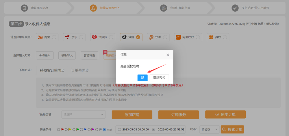 9、这时会看到店铺已添加成功,可同步订单(然后也能根据标记,时间,状态,搜索商品等来筛选订单)——勾选订单——提交